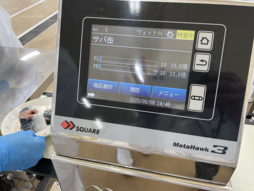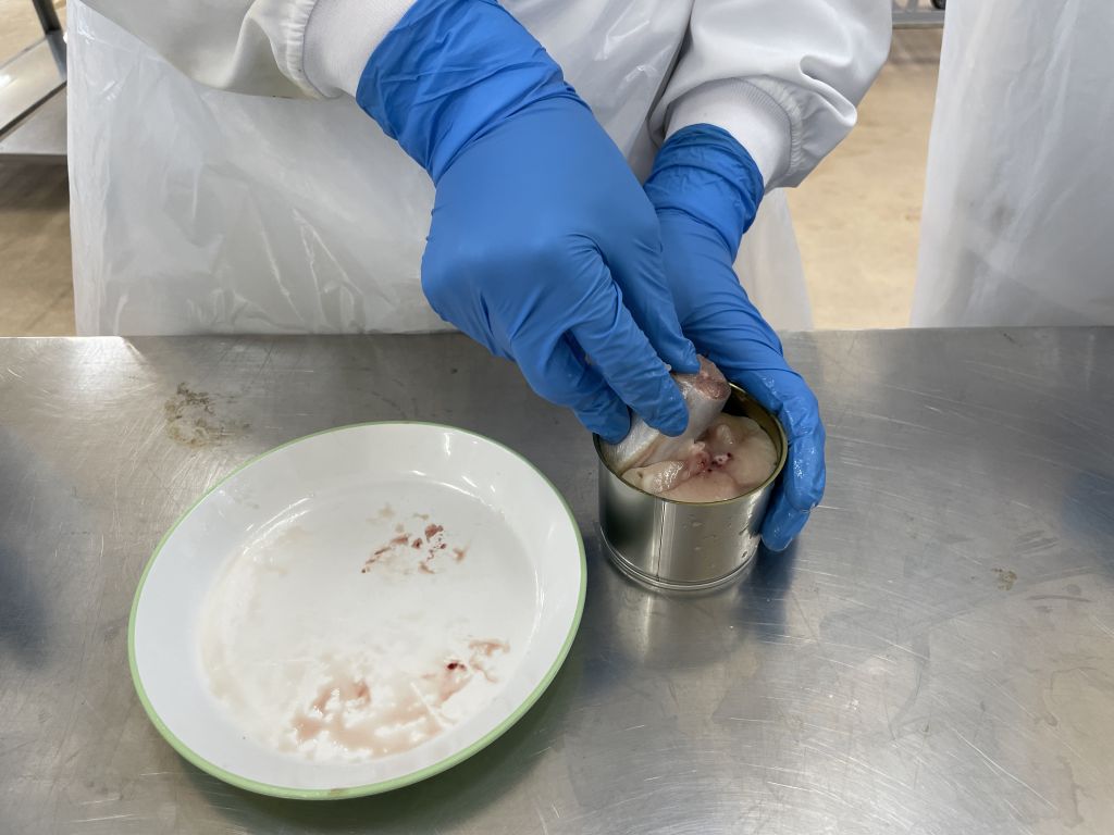 計量後、お皿にのせた状態で金属探知機を通過させます。そして、空の缶にサバを詰め、1.25%の食塩水を注ぎ、蓋をします。