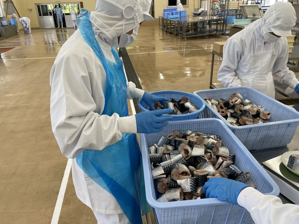 原材料は、ノルウェー産のバを使用します。冷凍されたサバを解凍し、洗浄後にカットします。