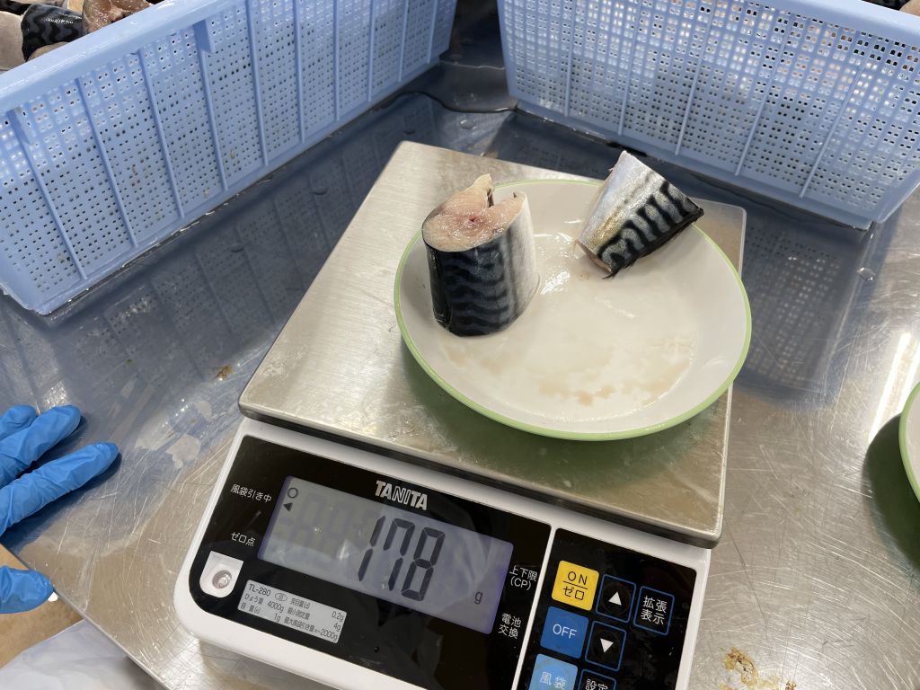 斜めになったり、身がくずれないように気をつけながら、慎重にカットします。背びれを切り落とし、缶に入る大きさにしてから、お皿に置いたまま計量します。