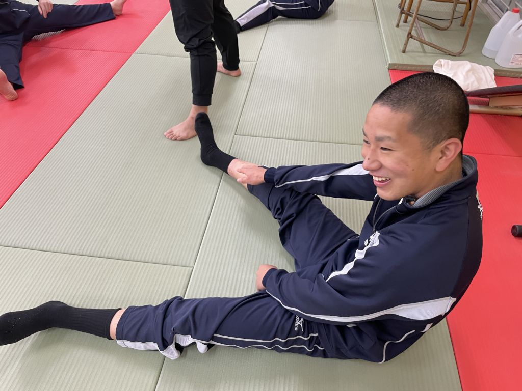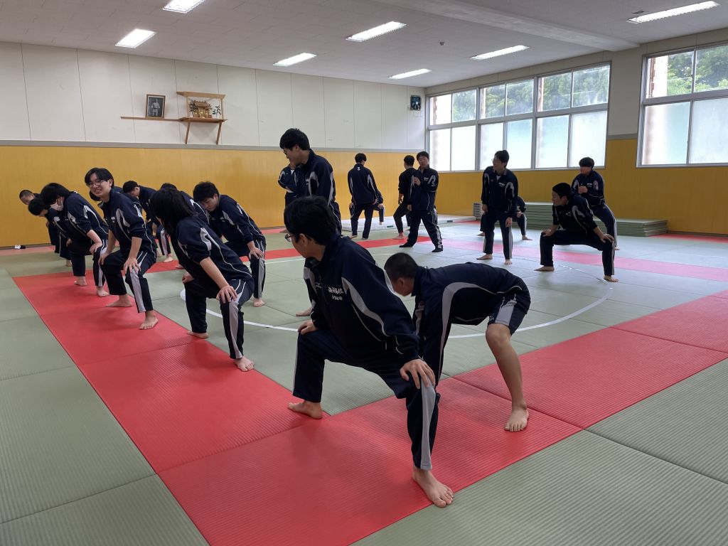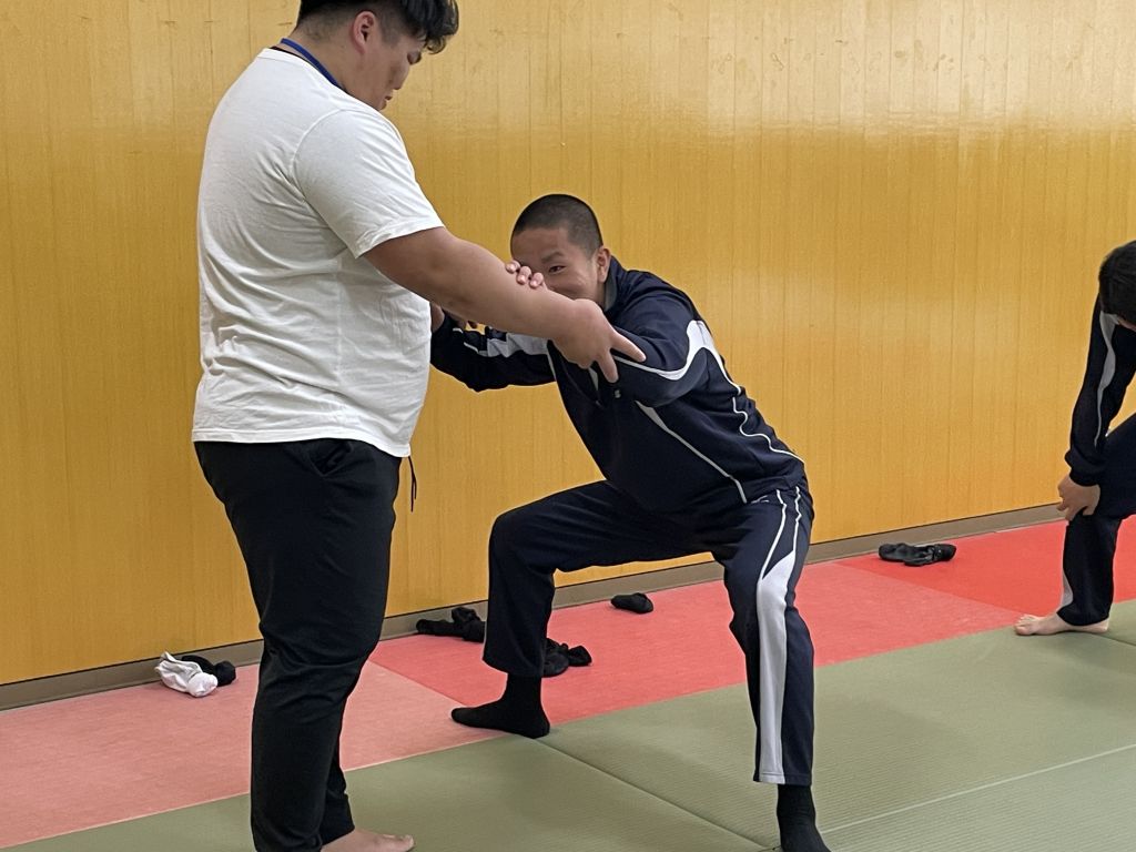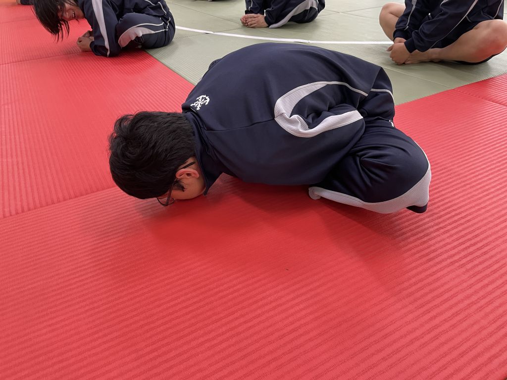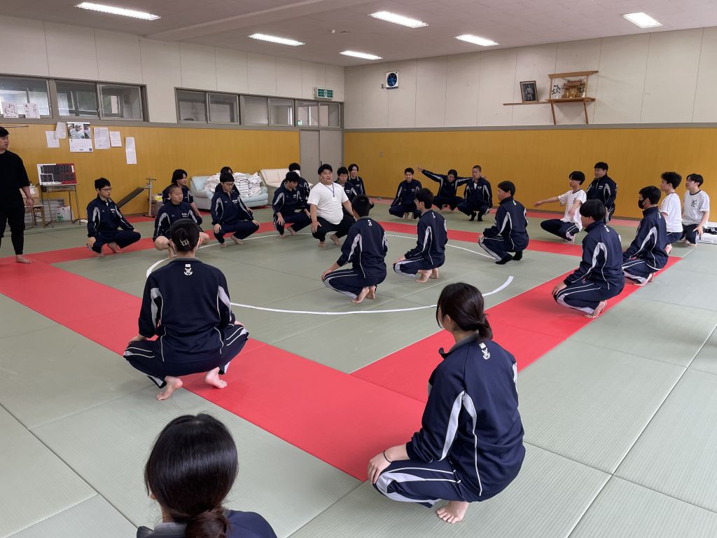 最後に、蹲踞(そんきょ)を教えていただきました。蹲踞 (そんきょ) とは、 上体を正したままつま先立ちで腰を下ろし、膝を開いた姿勢 のことです。 相撲の取組前に礼儀として用いられます。相撲の稽古では、終わりの挨拶として蹲踞があるとのことでした。今日一日の稽古を静かに振り返る時間で、黙想します。相撲の授業でも、終わりの挨拶として蹲踞(そんきょ)をすることになりました。授業を振り返る静かな時間が心を落ち着かせてくれました。