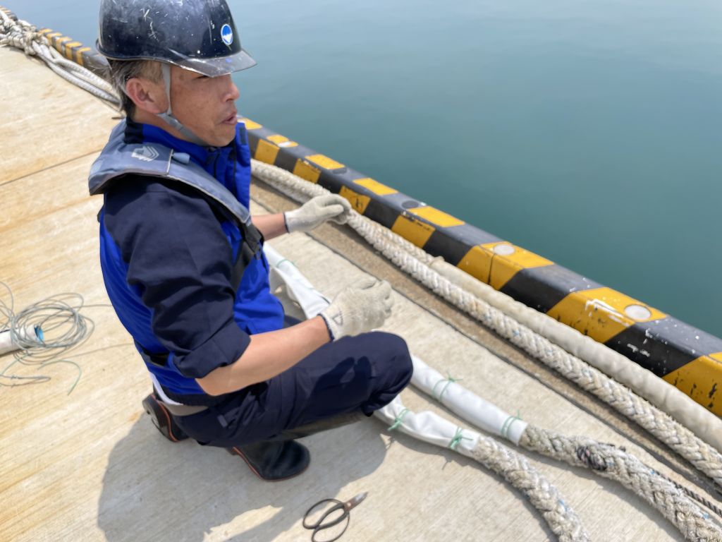 海洋丸甲板長の安立さんは、海洋丸を港に結びつけるロープを擦り切れないように補修していました。船がいないタイミングでしかできない作業とのことでした。