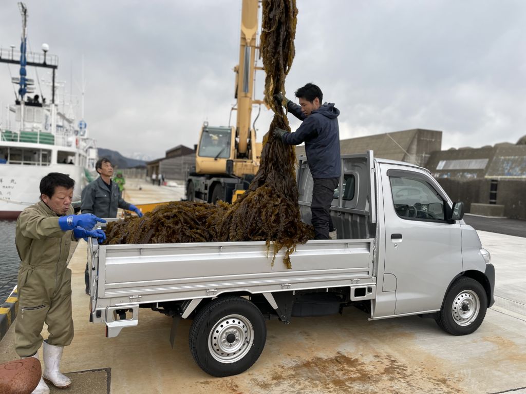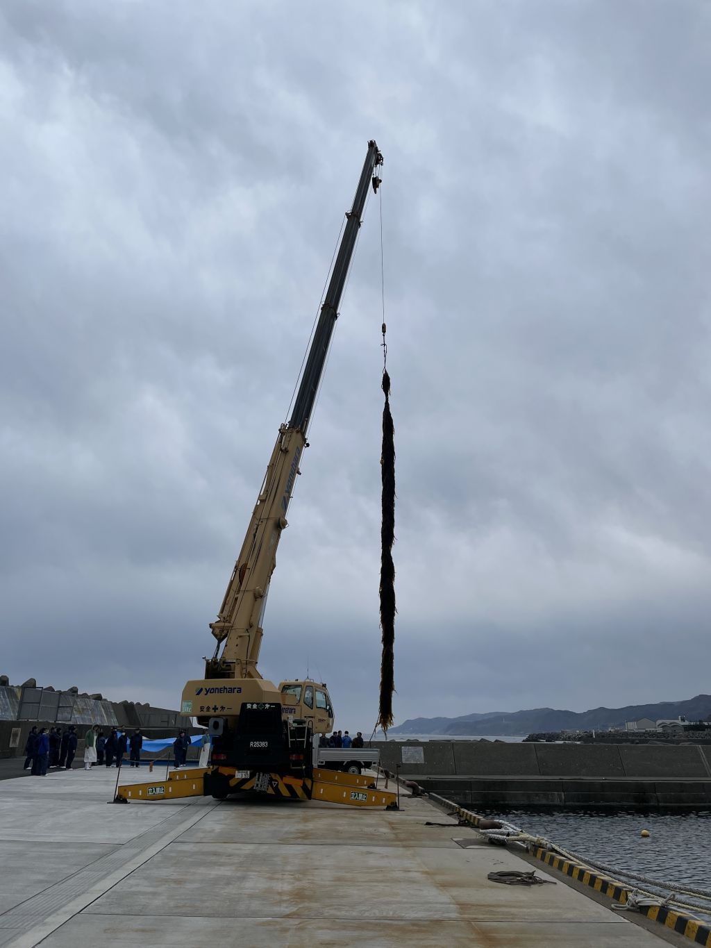 私たちは能生漁港で栽培しているコンブの収穫を行いました。 今回のコンブは量も長さも過去最大のものとなり、大変大きなクレーンで吊り上げるようなとても大きい物が収穫されました!