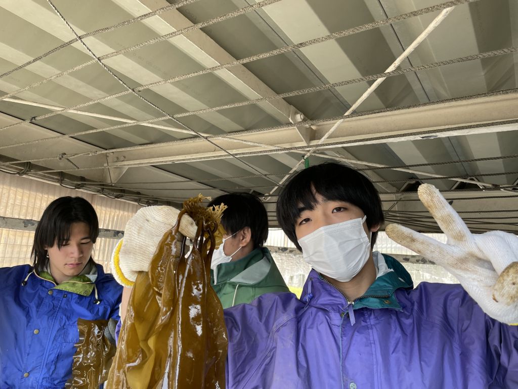 今回のコンブは去年の12月から実習を始めていおりそちらの実習では佐渡産のコンブの種糸をロープに結び付けます。コンブの種が流れないようにコンブを絡め方に工夫をしました。
