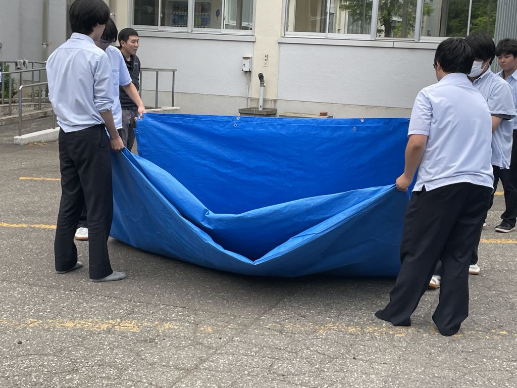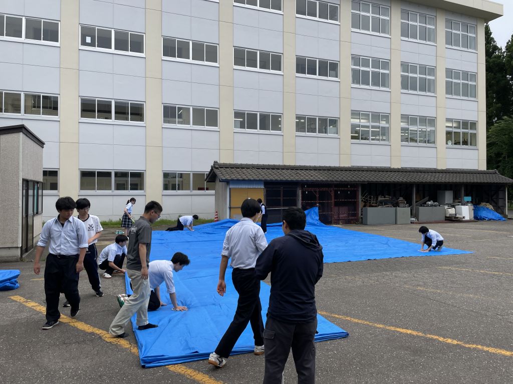 カッター大会とは、海で行う体育祭です。SUPレース、海上相撲などの競技で盛り上がり、クライマックスはクラス対抗のカッターレースがあります。今日は、大会で使用するブルーシートの点検と掃除です。土やほこりなどでよごれているため、ぞうきんでふきました。