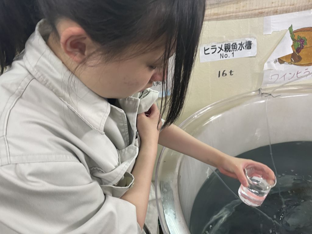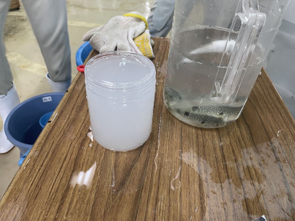 資源育成コースは、日本大学と共同研究をしている関係でクサフグの養殖を行っています。今回は、事前に生殖腺刺激ホルモンを注射して、採卵しました。