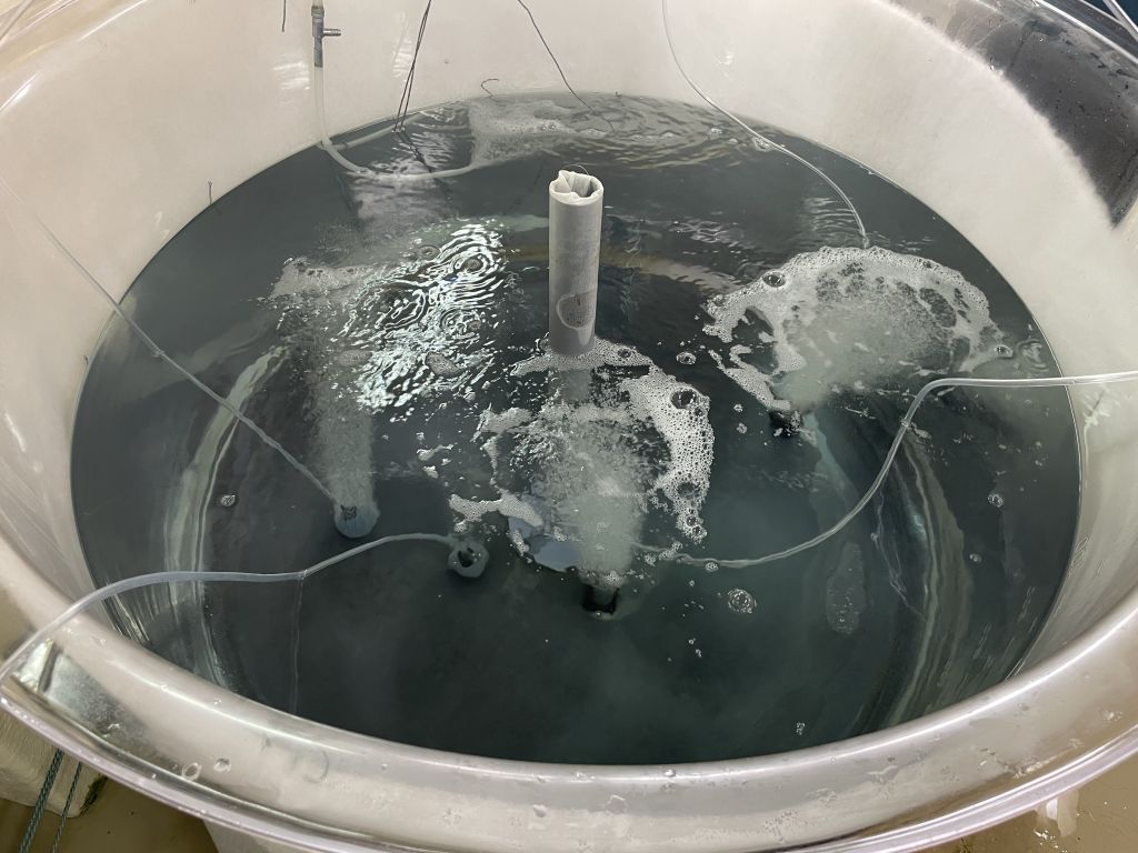 水槽中の受精卵計測のため、ビーカー100ml中の卵数を数えました。卵は、ビーカーの底に沈んでいることが多いため、目で確認しやすかったです。1週間ほどで孵化するので、これからの成長が楽しみです!