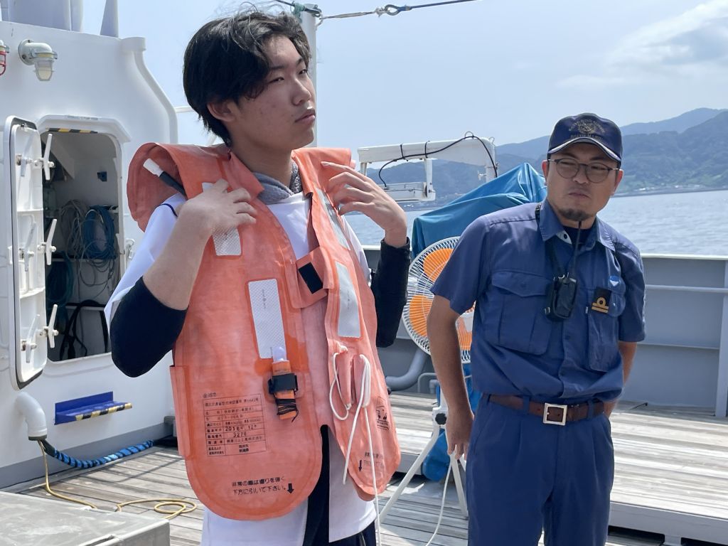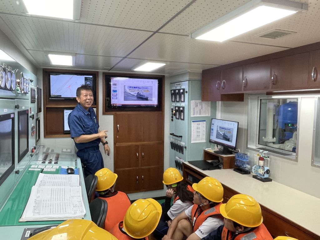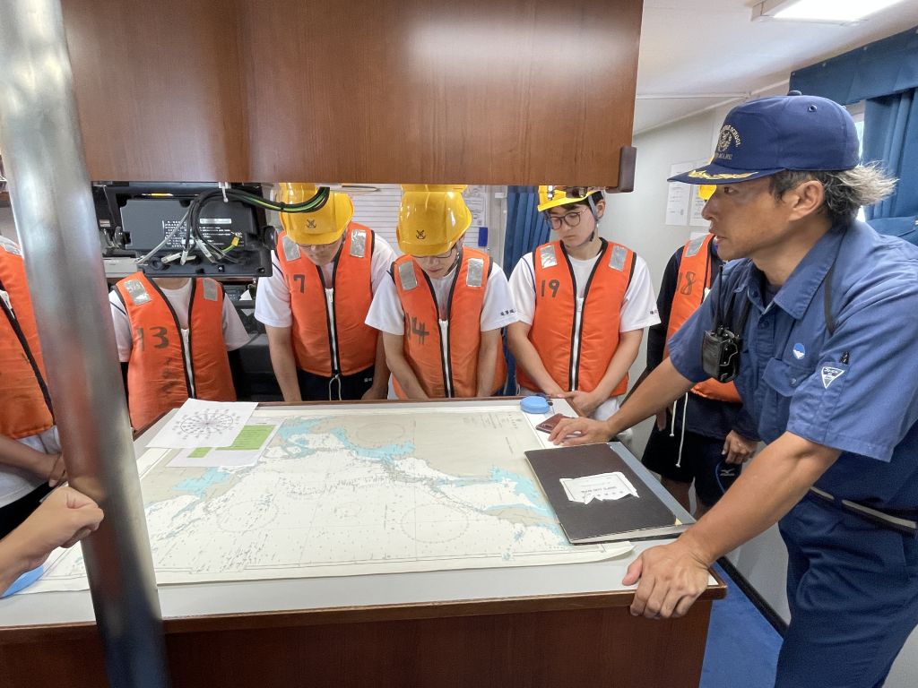 海洋丸がゆっくりと能生漁港から海へ進み出していく様子を見ながら、わくわくしていました。見慣れた能生漁港を離れ、目の前に海が広がってきましした。乗船式後は、船内見学です。まずは、救命着の説明を受け、ブリッジ→海図室→機関室と見学です。