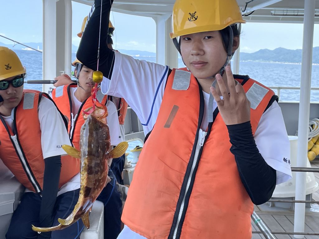 午後は、釣り実習です。ルアーを使い、水深を探りながら釣りをします。自分の釣り竿を持参する生徒もいて、結構本気です!さて、どんな魚が釣れたでしょうか?