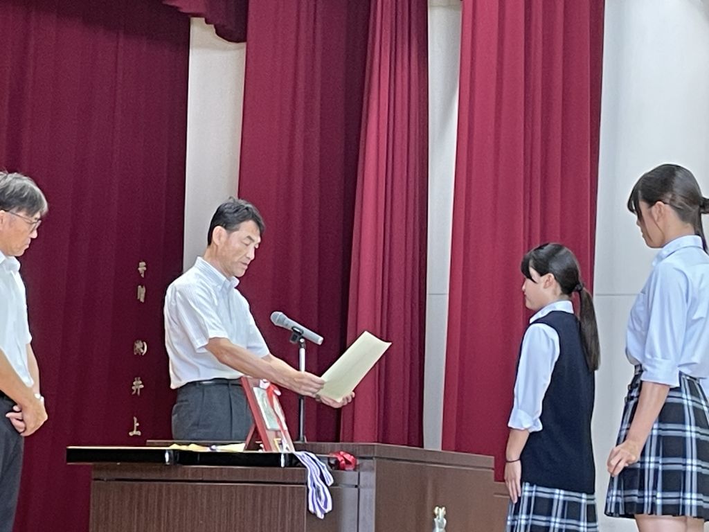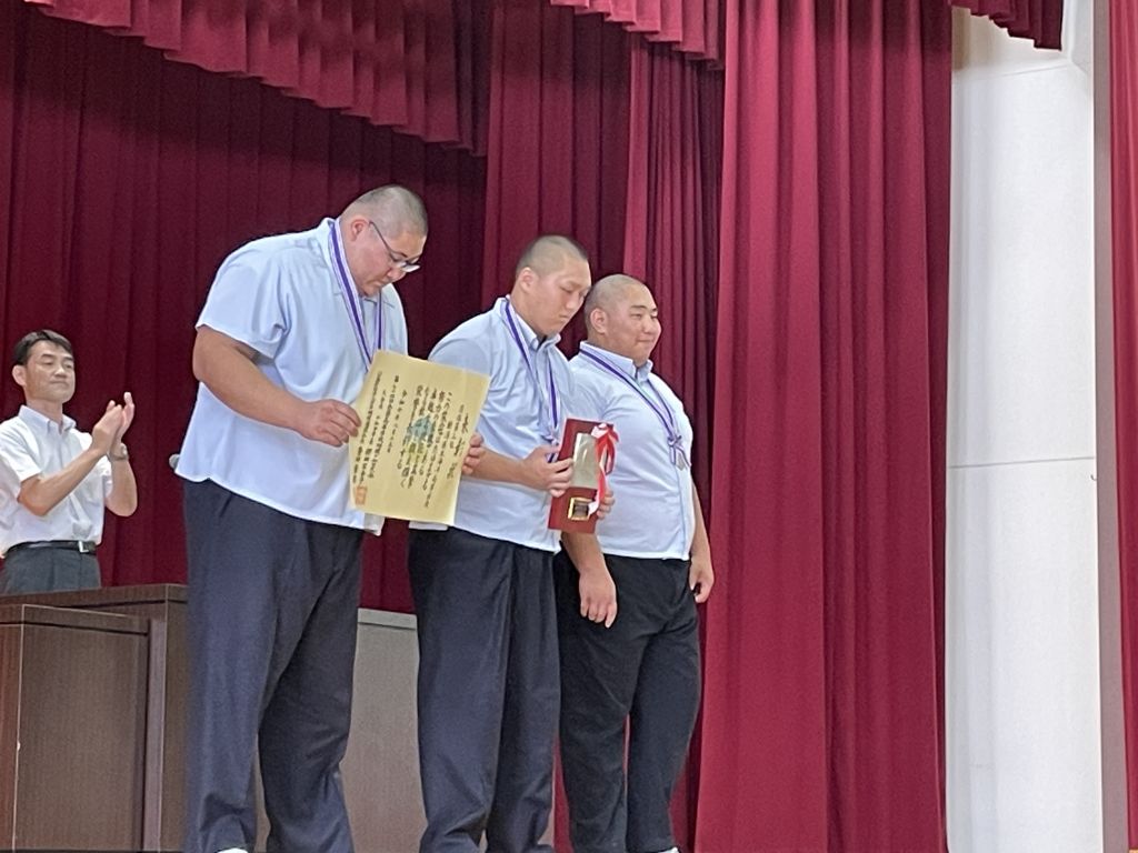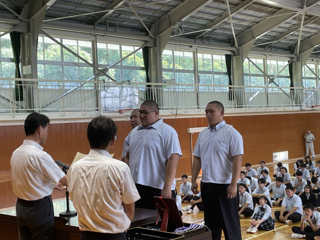 資源育成コース3年の小林です。8月29日に2学期が始まり、始業式前にダイビング部と相撲部の表彰がありました。
