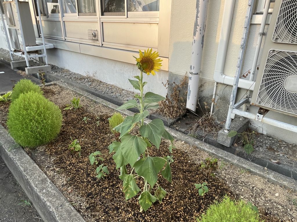 種を蒔くのが遅かったせいか、2学期の始業式の日に、ようやく1輪のひまわりが咲きました。まだまだ成長中のひまわりもあります!こちらは、10月の開花かもしれないので、気長に待ちたいと思います。ひまわりの次は、コスモスです。こちらも少しずつ成長中です!