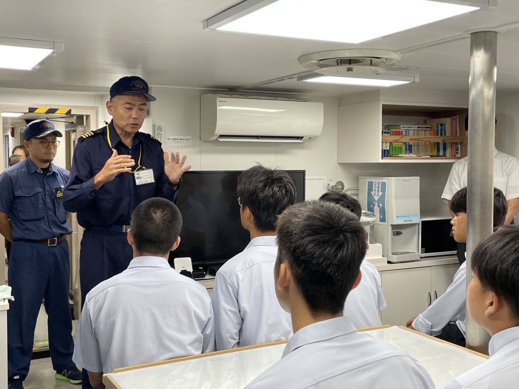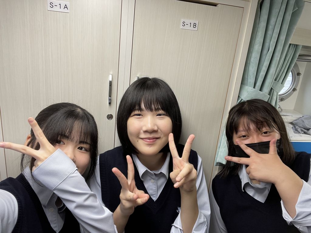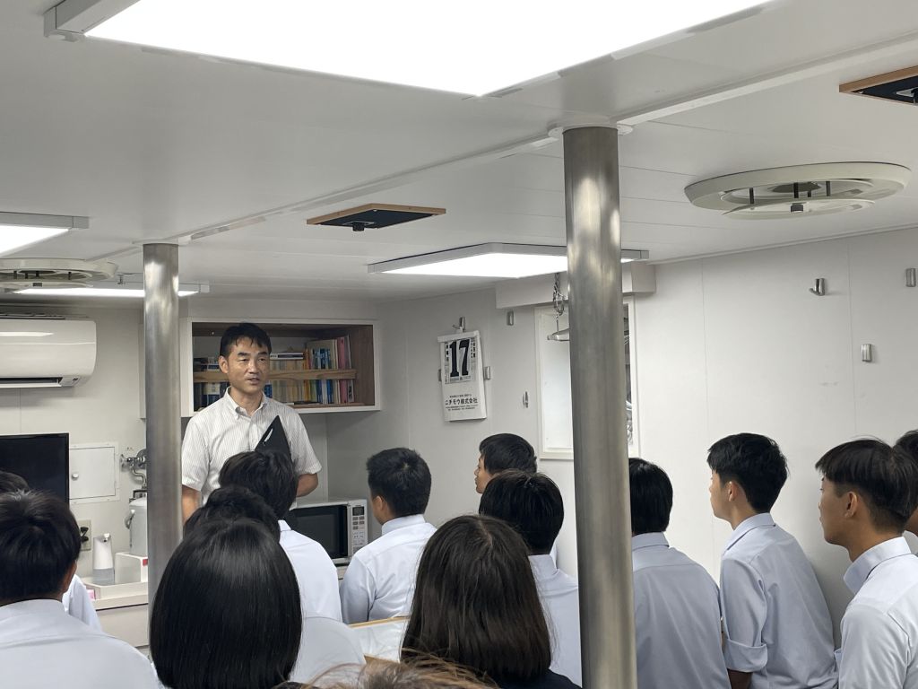 残念ながら、天候不良のため、乗船式は海洋丸の食堂で行われました。実習は、遊びではないという先生の言葉が胸に響きました。緊張感とシーマンシップを忘れずに、全員で助け合って、30日間の航海実習を乗り越えていきたいです。