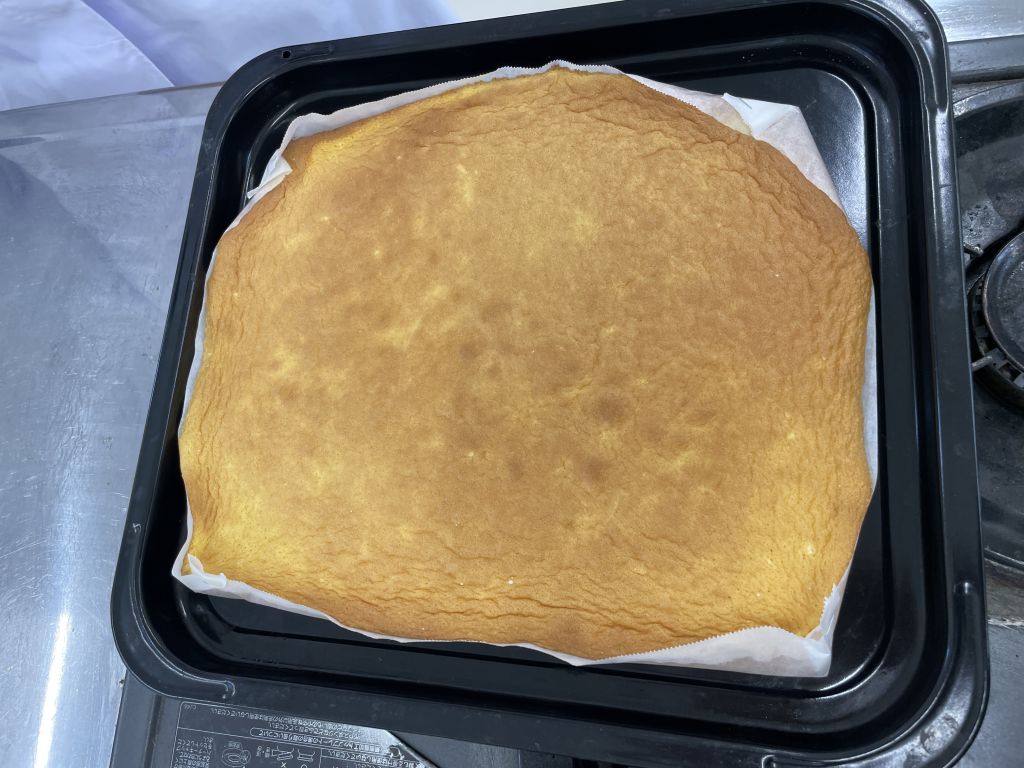 高温・短時間で一気に焼き上げるのがロール生地の鉄則です。表面を指で軽く叩いてみて、ジュワッと音がせず、弾力があれば焼き上がり!焼き上がってすぐ天板から外し、乾燥防止のためラップで巻くことで、「しなやかな生地」を保つことができました。