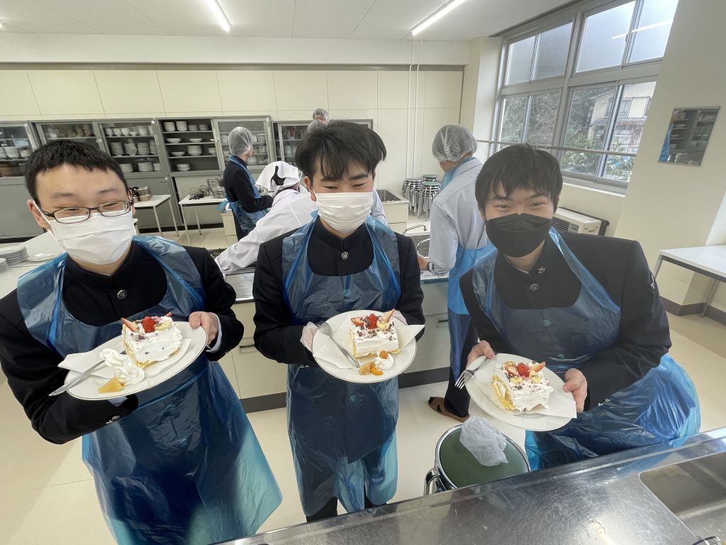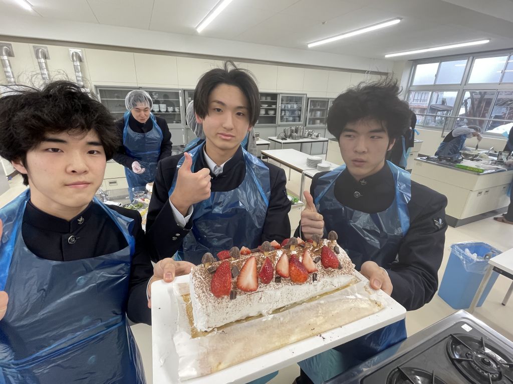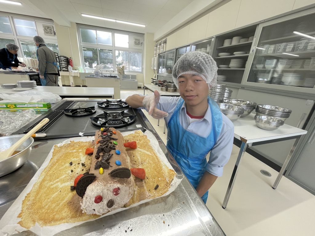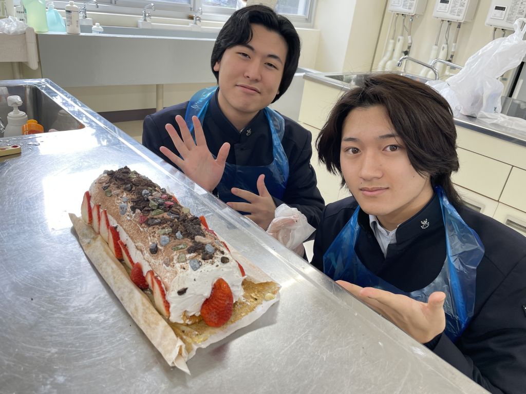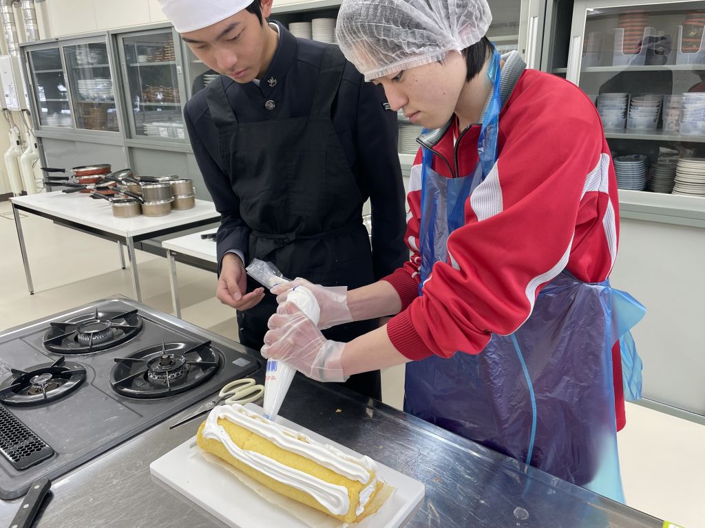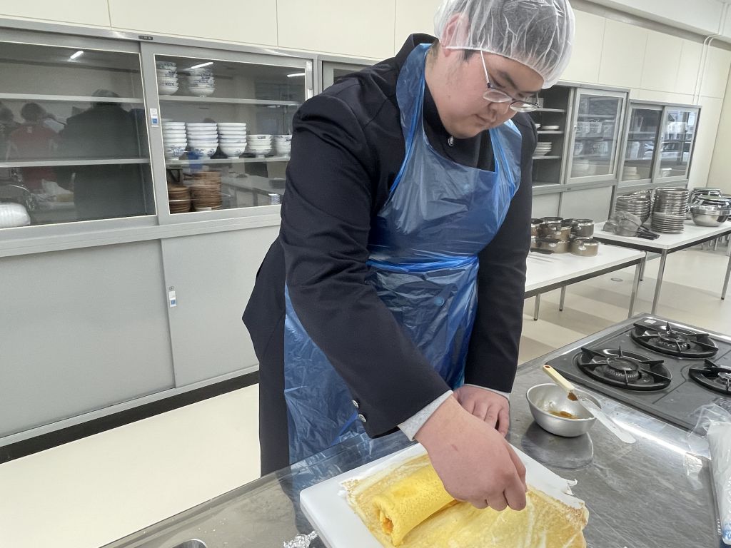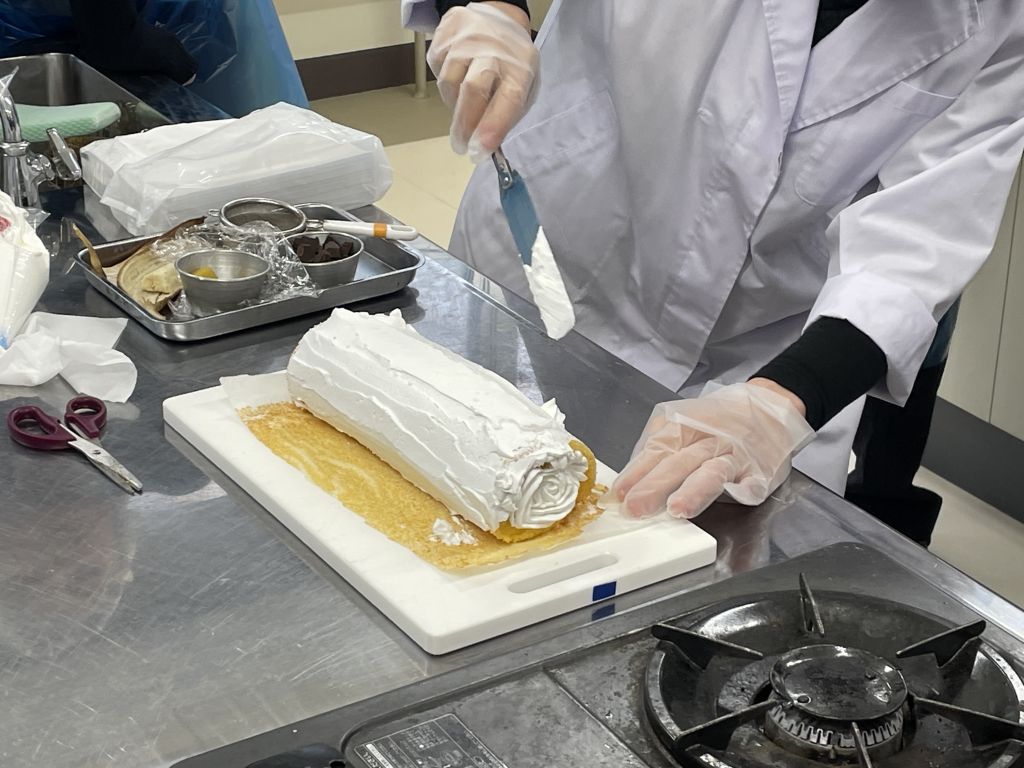 今日の調理実習では、前回の授業で焼いたロールケーキ生地を巻いて…いよいよ完成させます。