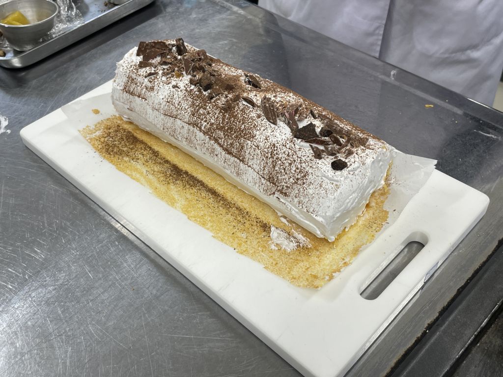 先生のお手本を見た時は、簡単そうに見えたけど、実際にやってみるとクリームを均一に塗るのがすごく難しかったです。巻き終わりが下になるように調整するのも苦戦しました。