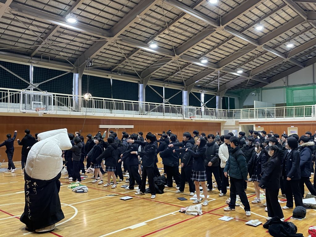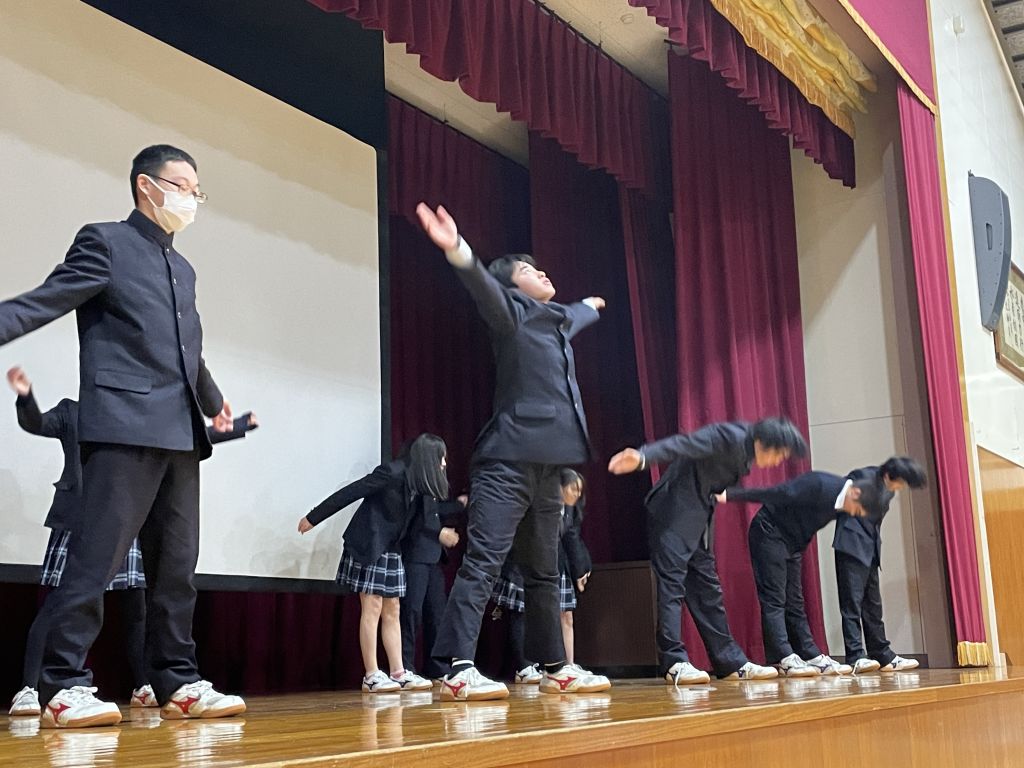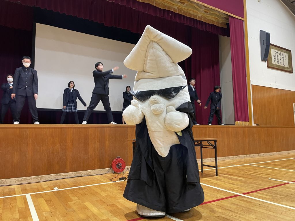 最初に、ブラック焼きそばのPRマスコットキャラクター「ブラック番長」と一緒に「みんなで学校体操」をしました。キビキビとした体育委員のお手本を見ながら本気で取り組みました。