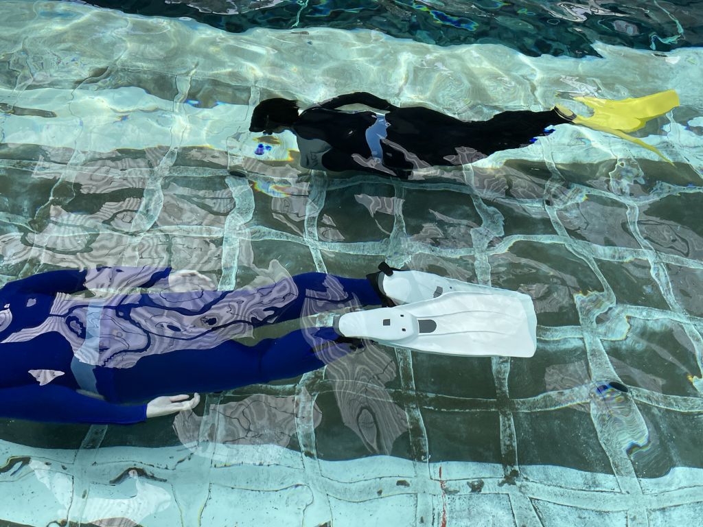 スキンダイビングとは、マスク、スノーケル(シュノーケル)、フィンなどの器材を使用しますが、スクーバなどの水中呼吸装置を使用せずに自分の息だけで潜水します。そのほかに、ウエットスーツやブーツ、ウエイトなどが必要になります。ダイビングが初めての生徒が多いので、まずはプールで練習をしていきます。