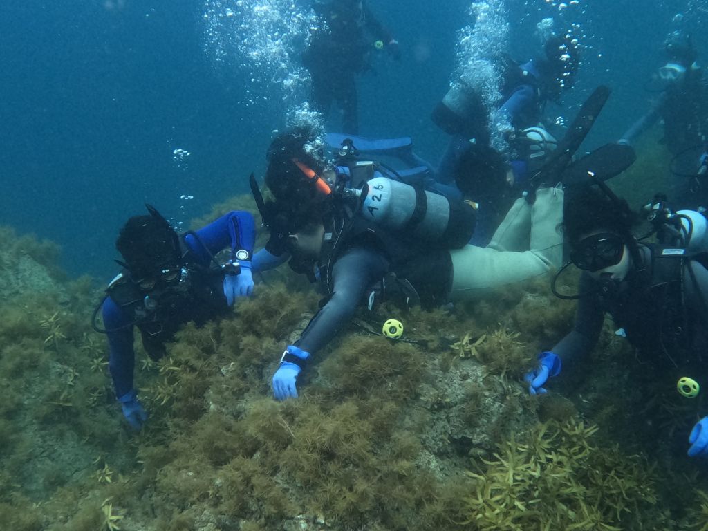海洋創造コースでは、海域、沿岸域の開発や整備、海洋構造物の工事などの知識や技術を身に付けるため、日頃から学習を行っています。海の建設工事や海洋環境の調査を行うための基礎的な潜水技術の習得する実習、防波堤の基礎づくりには欠かせない石均し(いしならし)やホースから空気が送られてくる送気式潜水で水中溶接の実習を行ないます。海での潜水実習は、透き通った青い海で普段は見ることができない海の生物が観察でき、とても感動的な体験ができます!