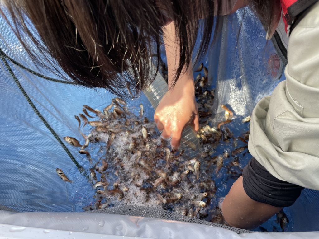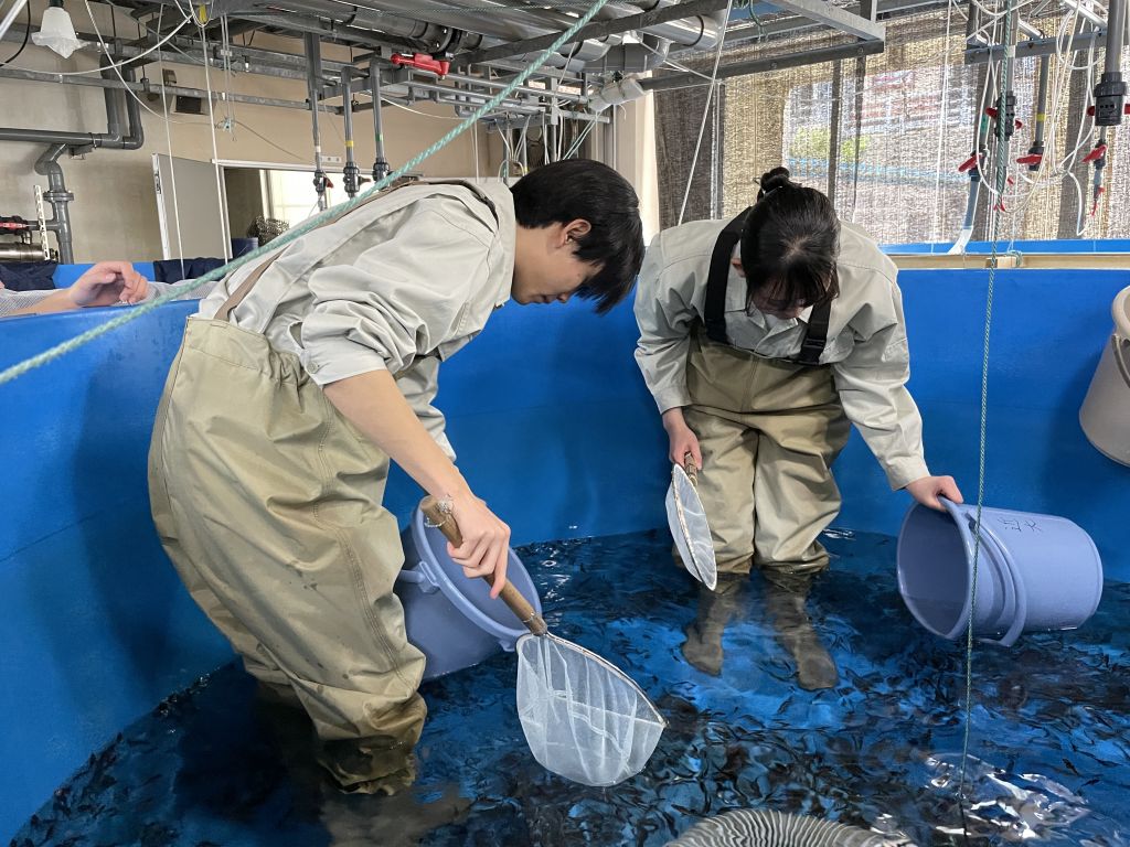 ヒラメの種苗生産と放流による沿岸資源の増大を目指した実習では、プランクトンしか食べない仔魚の飼育から放流まで、魚類養殖のイロハを学びます。
