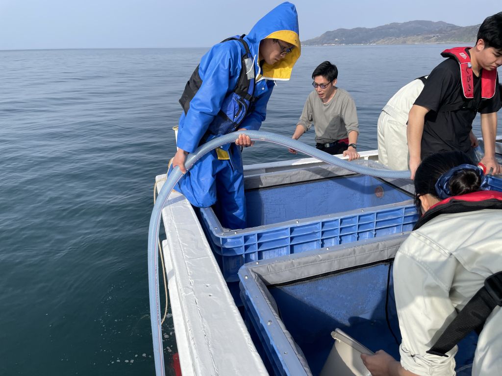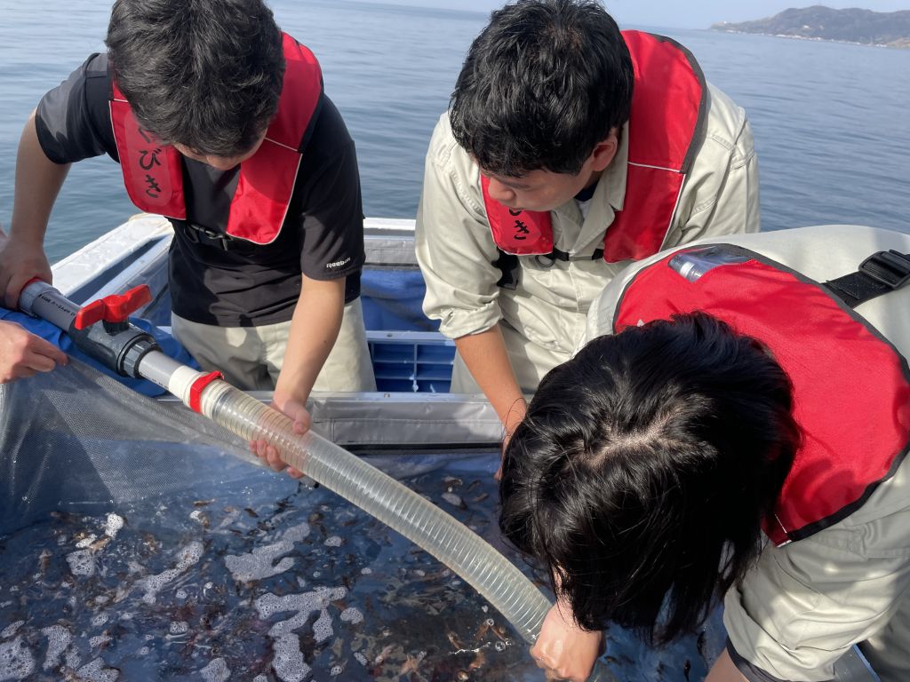 アカムツは、クロマグロの完全養殖で有名な近畿大学水産研究所と連携し、人工授精し、大切に飼育しています。放流は、栽培漁業臨海実習棟の水槽で飼育した稚魚を、トラックの活魚水槽に積込み、実習船「くびき」の活魚水槽まで移し、約12mの長さのあるホースを使用して海中に放流しています。