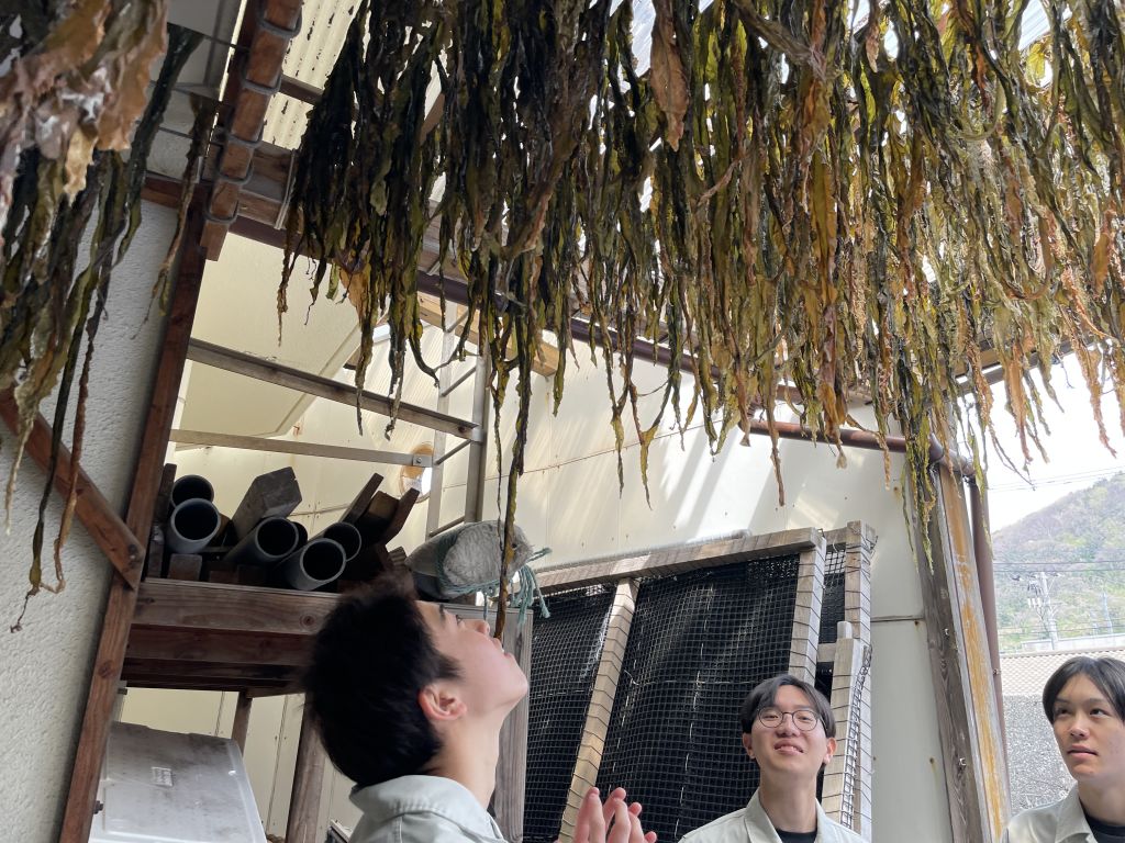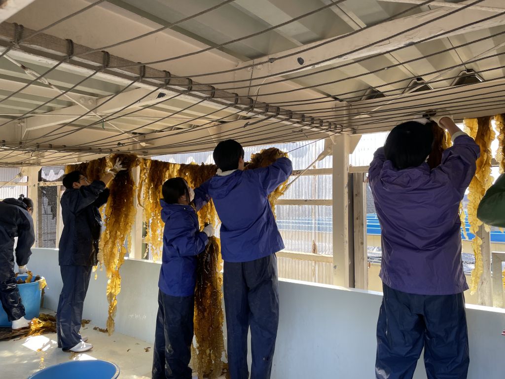 マコンブ養殖実習では、海藻の生態や環境問題について学習するだけでなく、地域の企業と連携してうどん等に加工し販売しています。