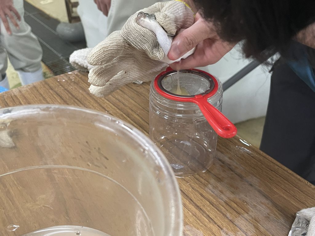 日本大学と共同研究をしている関係でクサフグの養殖を行っています。事前に生殖腺刺激ホルモンを注射して、採卵後、人工授精を行なっています。卵から育て、飼育管理をしています。